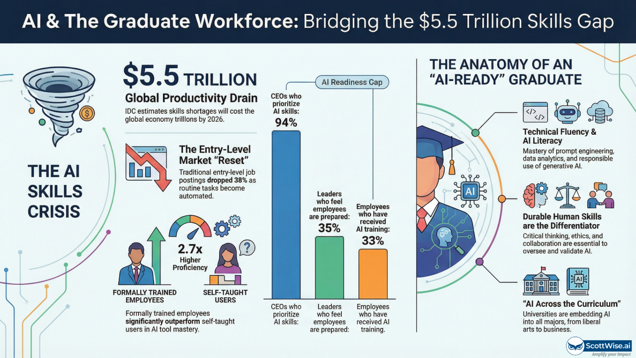 According to a 2025 report by IDC, the global economy risks losing $5.5 trillion in potential productivity over the next few years due to a persistent skills gap in AI and related technologies. And yet, even as CEOs rank AI adoption as a strategic priority (“94% of CEOs say AI is critical to their business model”), only 35% believe their workforce is adequately prepared to use it effectively. This disconnect has created what some analysts are calling a "capability vacuum" at the start of the career pipeline.