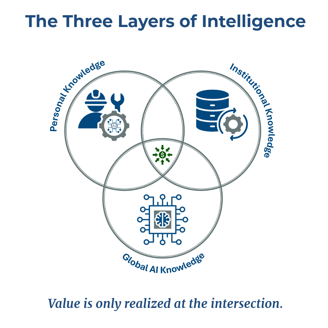 The problem isn't the technology. It's the assumption that access creates advantage. It doesn't. Real value is only created at the intersection of three things — your people's expertise, your organization's knowledge, and AI's global capability. Most investments are funding only one of the three.